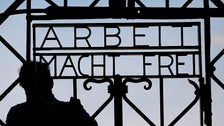 The German phrase on the protest sign, “Arbeit Macht Frei,” was written in the gates at Auschwitz and other Nazi death camps.