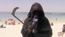 Uhlfelder wasn’t dressed in a suit or even swim trunks. Instead, he was wearing a grim reaper costume, even when he was interviewed by a reporter for local station WMBB.