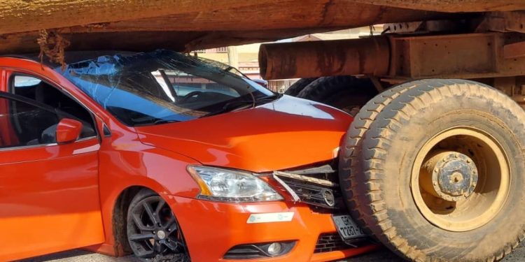 A timber truck which is believed to have had a break failure crashed into a red Nissan Sentra sedan as captured in the images below.